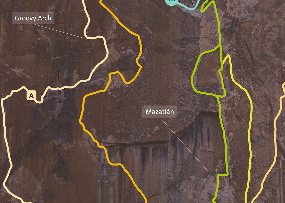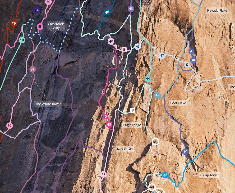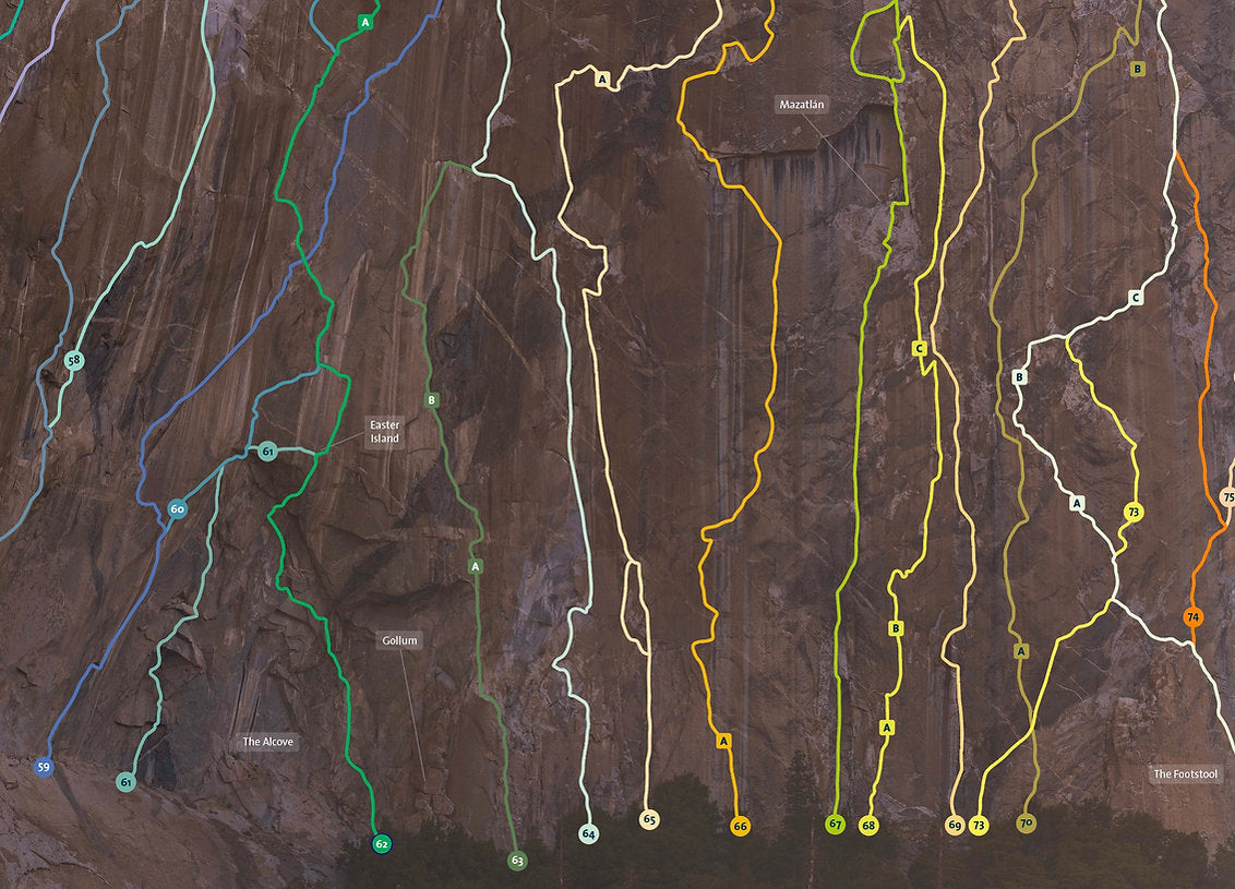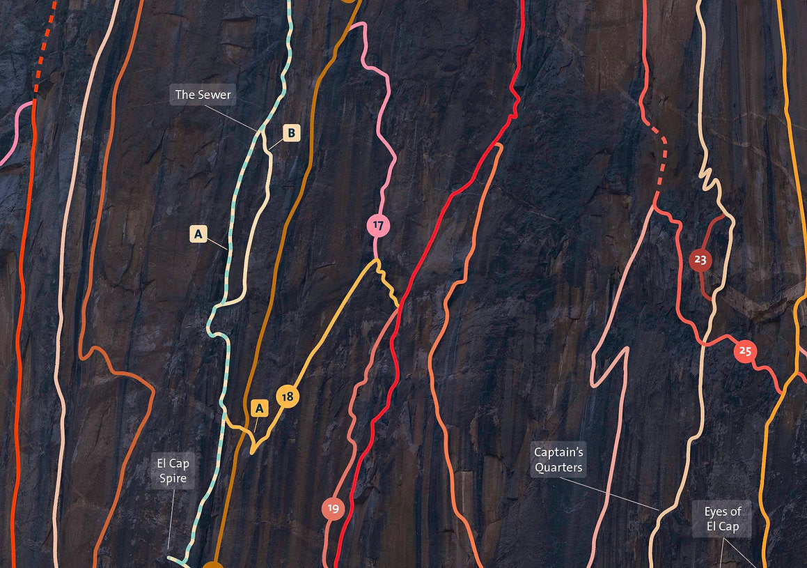 Entirely redrawn from a massive 2.8 gigapixels image shot last spring, this is the most complete El Cap lines poster ever. It shows 111 routes on the southwest and southeast faces, including the latest (Direct Line, Ephemeron and Neptune) and the most obscure (Turning Point, Central Scrutinizer, Hamas Fights for Freedom, Block Party) as well of course as all the classics (the Nose, Salathe, Free Dawn, Zodiac...). For the first time (to my knowledge), the crazy and never repeated Girdle Traverse is also drawn. Over 195 identifiable features, flakes, ledges, towers and cracks are shown, and every single named pitch or variation (254 in total) is marked as well. It's a monster.