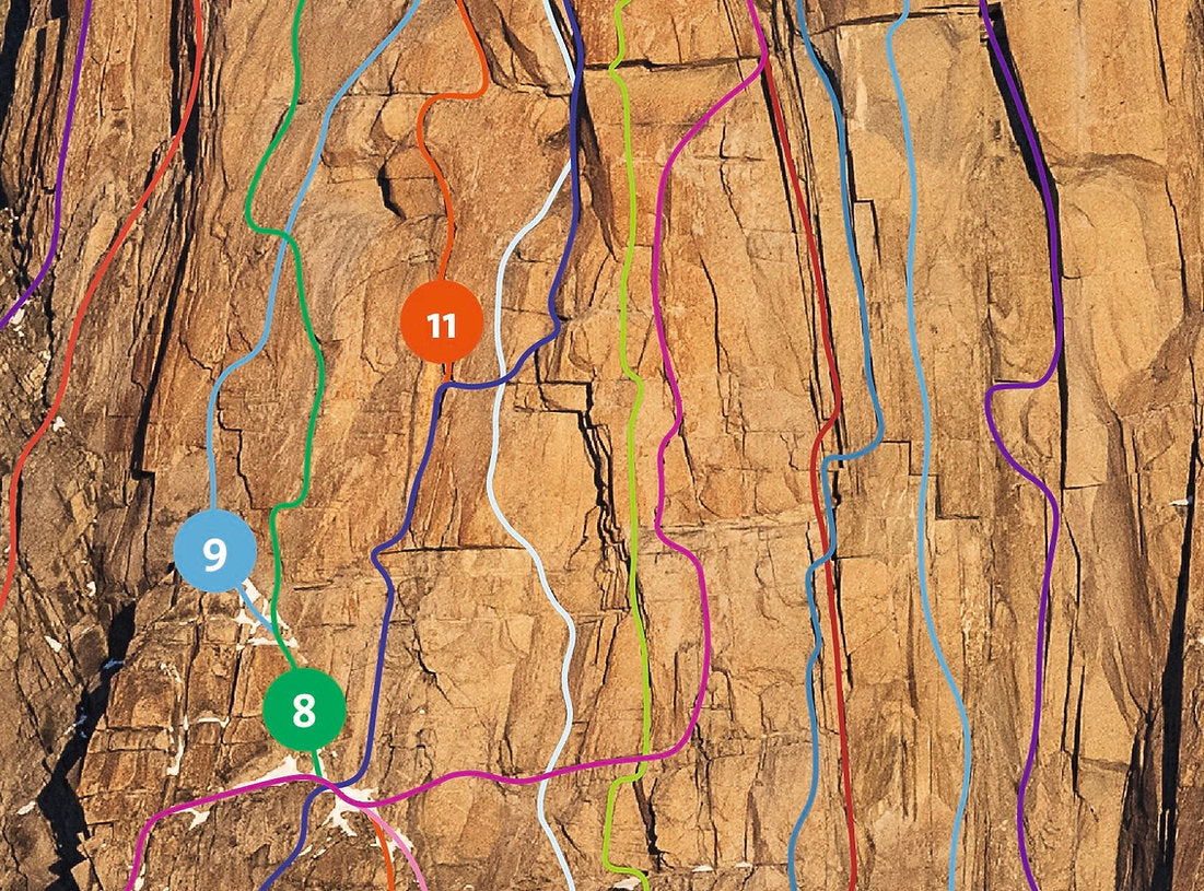 The steepest granite playground where legends of climbing, from Bonatti to Piola and Petit, have been making their marks over the years. Also includes lines on Chandelle du Tacul, Trident du Tacul, Petit Capucin and Roi de Siam.