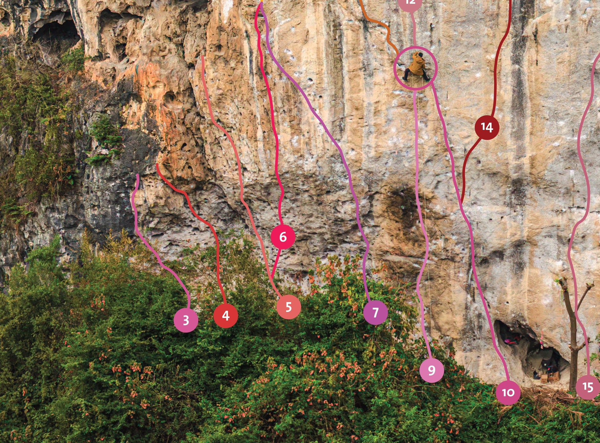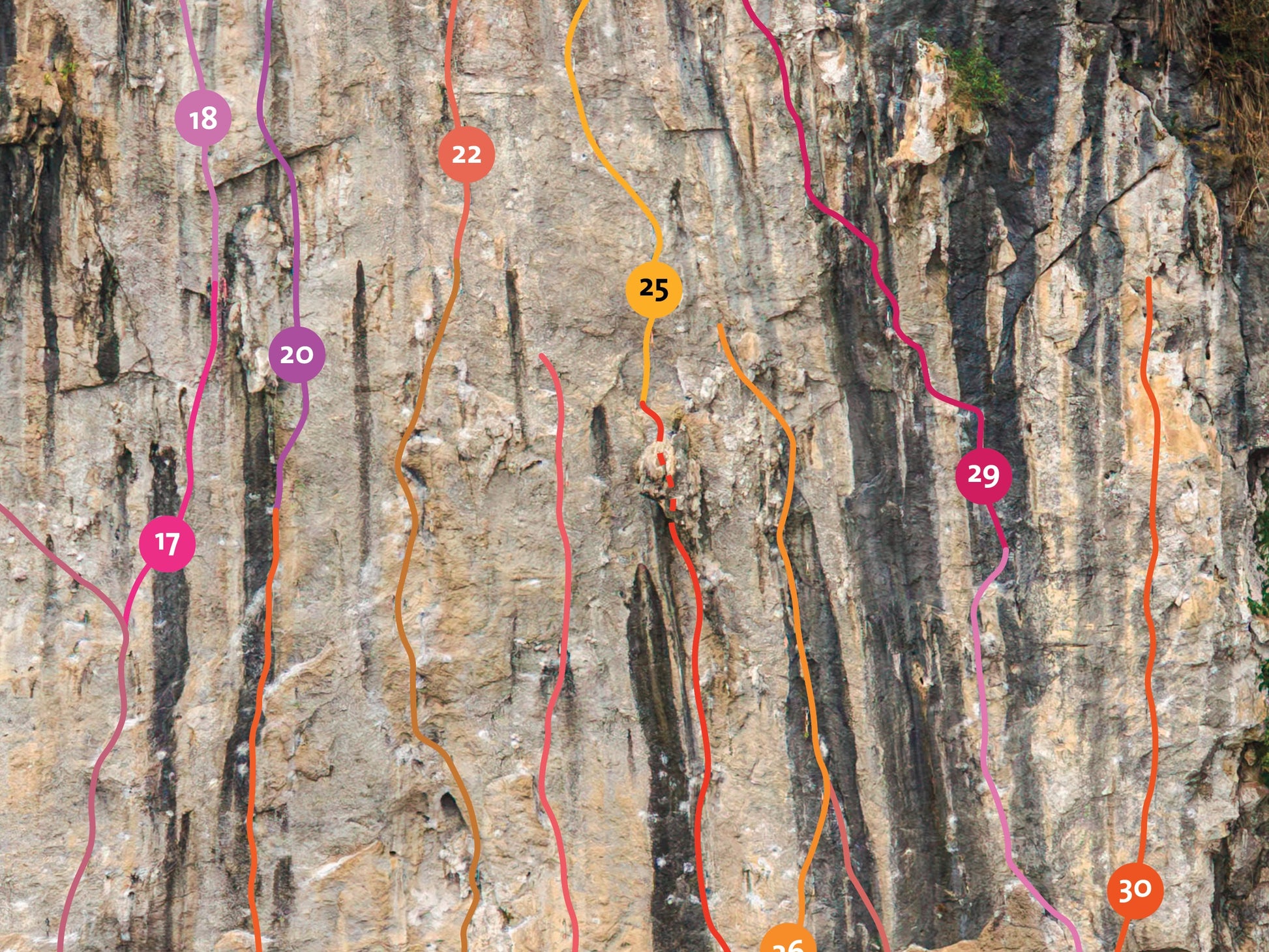 If White Mountain is the largest and hardest, Leipi is probably the most popular (and crowded!) crag in Yangshuo. Right above the road, with a solid 15 seconds approach (one could probably belay from the parking lot), it punches way above its size with legendary routes like Tornado (line 13), Thunder (19) and Lightning (22).