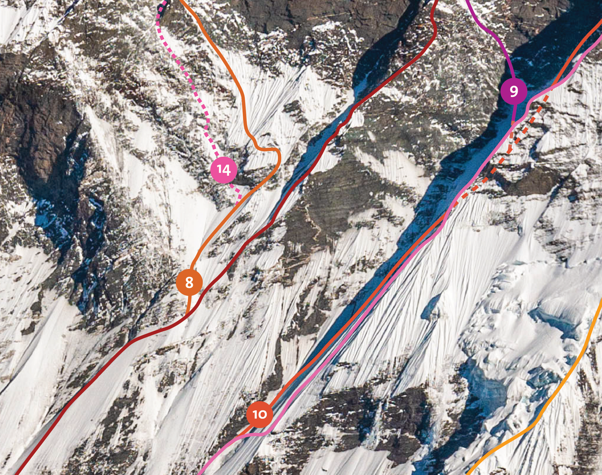 This image was shot from the summit of Imja Tse (also known as Island Peak) and, uniquely for Mont Blanc Lines, also shows all attempts on the face instead of just completed routes. The very disputed solo line of Tomo Cesen is also included.