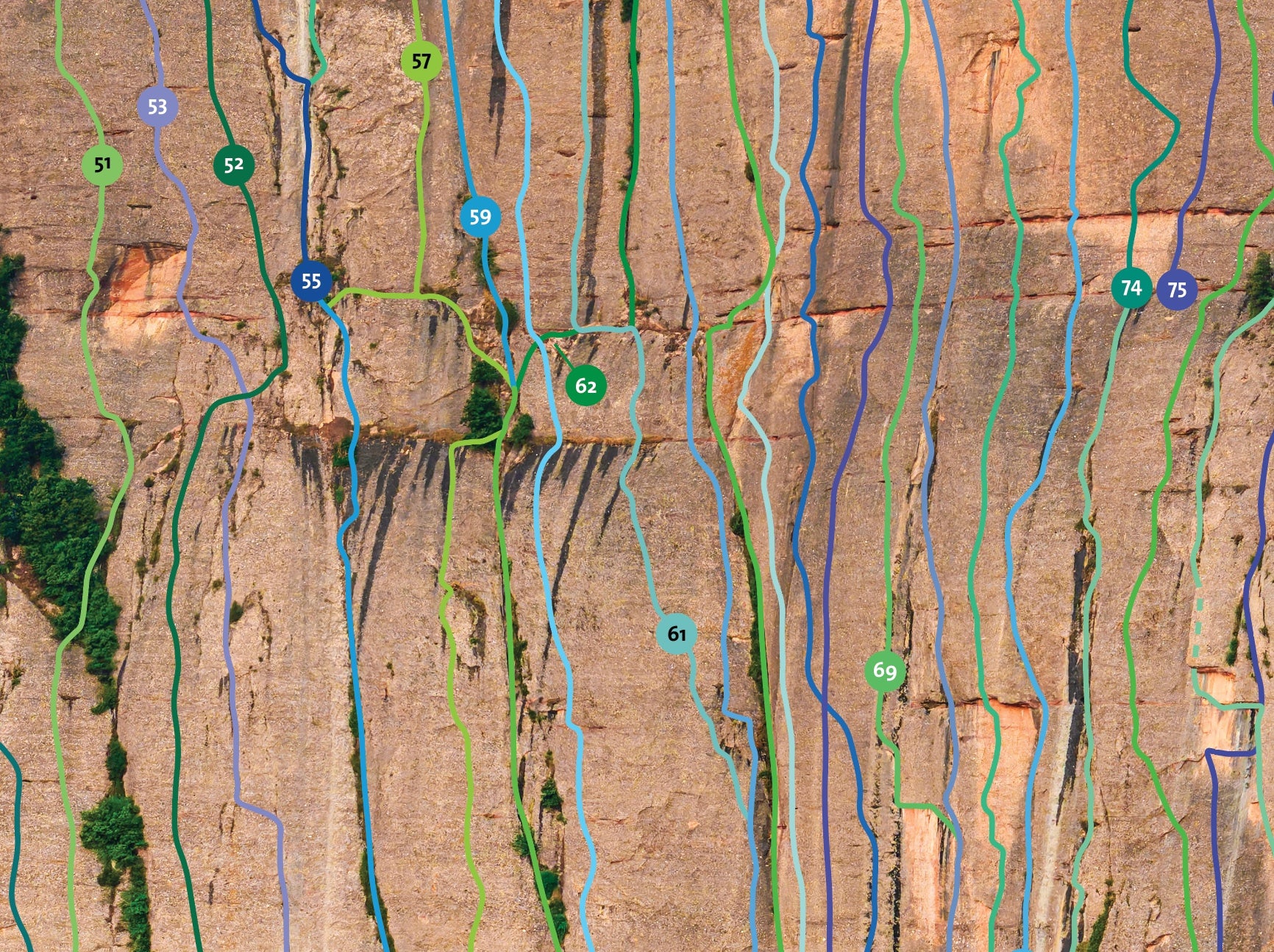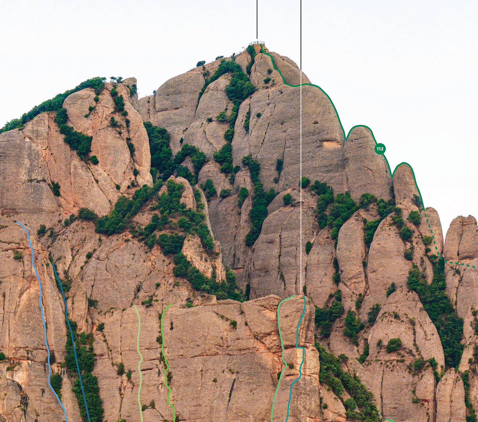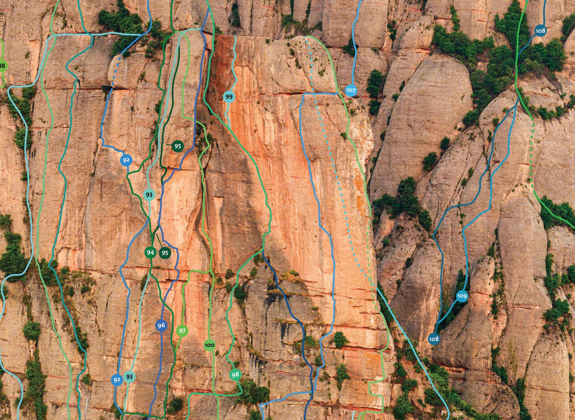 This image shows not only all routes on the face itself, but also on several other major features: Cavall Bernat, Paret dels Diables, Serrat del Patriarca, Serrat del Moro and even Paret dels Ecos.